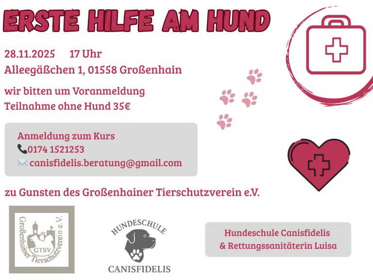 Unser Seminar am 28.11.2025 in Großenhain zum Thema Erste Hilfe am Hund war ein richtig schöner Abend. Gemeinsam mit euch wurde daraus ein lehrreicher Seminarabend, an dem wir viel Wissen teilen und viele Fragen klären konnten. Vielen Dank, dass ihr dabei wart und diesen Abend so angenehm gemacht habt. Alle Einnahmen des Seminars gehen an den Großenhainer Tierschutzverein e. V.
